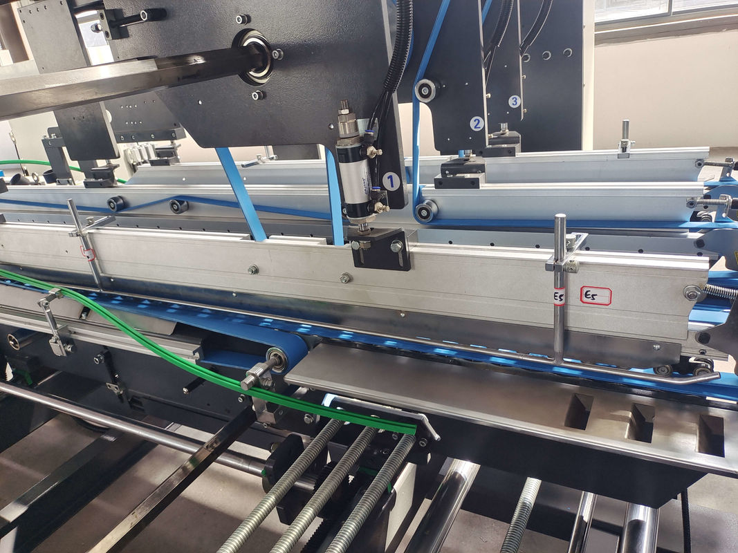 ساختار سه صفحه ای، کمربند بالایی نوع درایو اصلی است، برای اطمینان از انتقال کاغذ صاف.تسمه پایینی 50 میلی متر، تسمه بالایی 30 میلی متر است و تسمه فشار بالایی به صورت پنوماتیک بالا و پایین حرکت می کند تا با ضخامت های مختلف مقوا سازگار شود.مجهز به سیستم ضد قلاب، با سیستم 4/6 نقطه ای همکاری می کند تا مطمئن شود شکل گیری جعبه خوب است.